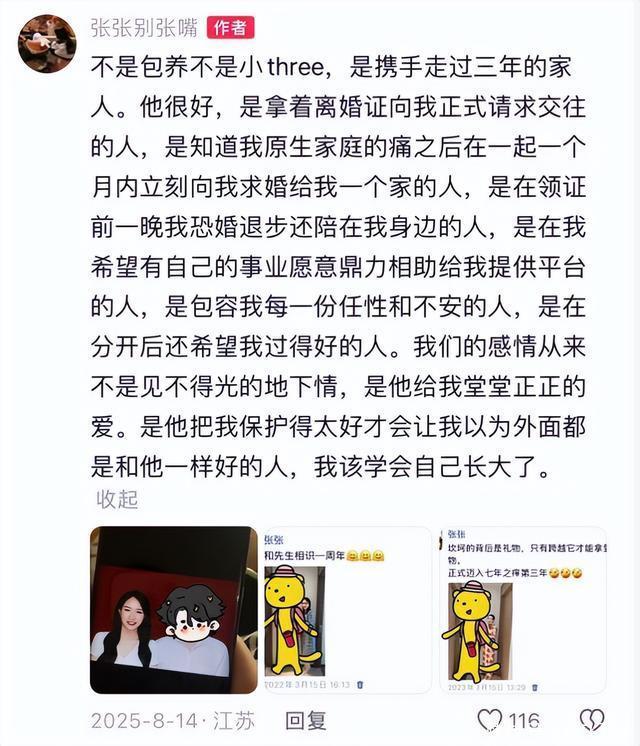 谁能想到,张雪峰猝然离世还不到3天,舆论就从全网悼念变成了恶意泼脏水。 3月24日,这位被无数普通家庭奉为“报考灯塔”的教育博主,因心源性猝死抢救无效离世,年仅41岁。可就在官方讣告发布、全网沉浸在悲痛中时,各类离谱谣言接踵而至,出轨、感情混乱、遗产争夺等恶意揣测刷屏网络。 就在此时,一个自称张雪峰前女友的女生“张张”,素颜出镜哭到红眼,打破沉默为他发声,不仅否认所有抹黑言论,更首次曝光了两人三年感情的始末与分手真相。 3月25日深夜,一个关注度不高的社交账号突然更新,一段近7分钟的素颜视频迅速冲上热搜。镜头里的张张,头发凌乱、双眼红肿如核桃,鼻尖通红,嘴唇干裂起皮,没有滤镜加持,没有剧本修饰,每一句话都带着浓重的鼻音和止不住的哽咽。 她对着镜头缓缓开口,语气里满是委屈与无力:“我本来什么都不想说,就想让他安安静静地走,可你们现在,不仅扒他、骂他,还要往他身上泼脏水,把所有跟他有关系的人都拉出来踩一脚,我真的忍不下去了。” 张张直言,自己与张雪峰的感情清清白白、坦坦荡荡,既没有插足他的婚姻,也没有贪图他的钱财。“你们可以不相信我,但求你们放过一个已经离开的人,别再消费他,别再抹黑他。”视频最后,她哭着承诺,等情绪平复后,会把所有事情原原本本说出来,不为洗白自己,只为给张雪峰一个清白,给两人三年的感情一个交代。 这段视频一经发布,网友两极分化。有人心疼她的遭遇,感慨“分手了还能如此护着,这份情义太难能可贵”;也有人提出质疑,认为她此时发声是为了蹭热度、涨粉变现。面对两极分化的舆论,张张没有辩解,只是陆续晒出相关证据,一点点还原这段被隐藏三年的感情真相。 张张在后续的动态中明确表示,她与张雪峰的相遇,始于张雪峰与第一任妻子李丽婧和平离婚半年后。2020年12月31日,张雪峰曾公开宣布结束第一段婚姻,两人育有一女张姩菡,离婚后选择共同抚养,并无任何矛盾纠纷。 彼时的张雪峰,刚经历婚姻变故,又深陷事业高压,正是人生中最孤独、最迷茫的阶段。就在这时,他与张张相遇,两人相处融洽、三观契合,很快便产生了情愫。 张张回忆,张雪峰从未隐瞒自己的过往,主动拿出离婚证,坦诚告知自己的家庭情况、孩子的近况,没有欺骗,没有敷衍,而是光明正大地向她表白。 得知张张原生家庭不幸,从小缺少安全感后,张雪峰更是格外用心呵护,他曾郑重向张张求婚,承诺会保护她、照顾她,给她一个安稳的家,甚至两人已经拍摄了结婚登记照,挑选好了请柬样式,连婚房的装修风格都反复讨论了多轮。 值得一提的是,这段感情从一开始就选择不公开,而提出这个决定的,正是张张。“他有孩子,有公众身份,我不想因为我影响到孩子,不想让孩子在网上被议论。”张张坦言,她甘愿一直站在张雪峰身后,不抢镜、不张扬,无需任何名分,只想安安静静陪伴在他身边。 三年间,张张始终践行着自己的承诺,张雪峰公开活动时,她永远默默站在人群角落;他工作到深夜,她始终等他回家、悉心照料;他压力崩溃、情绪低落时,她是唯一能让他放松、给她安慰的人;甚至在张雪峰父亲住院期间,也是张张全程陪诊、学习打胰岛素、守夜看护,毫无怨言。 很多网友疑惑,既然两人如此相爱,又已经谈婚论嫁,为何最终会走向分手?张张在长文中,首次披露了分手的核心真相,没有狗血剧情,没有背叛欺骗,只有难以逾越的现实阻碍。 第一个原因,是张张深埋心底的恐婚心理。由于原生家庭的不幸,张张从小就对婚姻充满恐惧,害怕承诺,更害怕自己重蹈原生家庭的覆辙,即便张雪峰给足了她安全感,一次次用行动证明自己的真心,她内心的那道坎,始终难以迈过。 第二个原因,是无法违背的家庭规矩。就在两人准备领证、敲定婚期之际,张张家中至亲离世。按照当地习俗和家庭要求,她必须守孝三年,期间不能订婚、不能结婚、不能大办喜事。一边是深爱的人,一边是无法违背的孝道,两人陷入了两难境地。 除此之外,张雪峰日益繁忙的工作,也让两人之间的距离逐渐拉大。随着事业不断发展,张雪峰需要常年高强度直播、跑线下讲座,陪伴张张的时间越来越少,聚少离多的日子里,误会渐渐积累,矛盾慢慢增多。 两人都曾努力过、挣扎过,试图找到解决问题的办法,可有些现实阻碍,终究不是靠感情就能克服的,最终,两人选择和平分手,没有互撕,没有拉黑,没有诋毁,只是体面告别。 张张坦言,张雪峰在事业上帮过她,在生活中照顾过她,在她最难的时候拉过她一把,这份恩情,她一辈子都铭记于心。“我们不是不爱了,是真的没办法,遗憾,但不后悔。” 随着张雪峰离世,很多过往的争议被重新翻出,其中最受关注的,便是去年伍佰演唱会上的“亲密视频”风波。当时,有网友拍到张雪峰与一位身形苗条的女生同行,举止较为亲密,随后“张雪峰婚内出轨”的谣言瞬间炸上热搜,不少网友纷纷指责他“人设崩塌”“忘本”。 张张此次发声,也专门澄清了这件事,她表示,当时与张雪峰同看演唱会的女生,正是她自己。“那天我们只是正常约会,被拍之后,他怕我被网暴,在直播间主动模糊回应,把所有压力都扛在自己身上。” 回看当时张雪峰的直播回应,他只是轻描淡写地说:“都是私人生活,大家别过度解读,别影响到别人。”如今再看这句话,满是对张张的保护与温柔。张张还透露,去年网上曾有谣言称她是“小三”